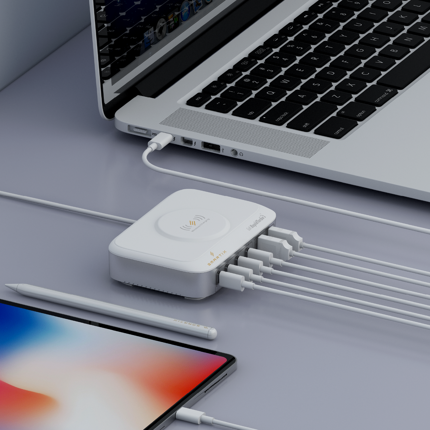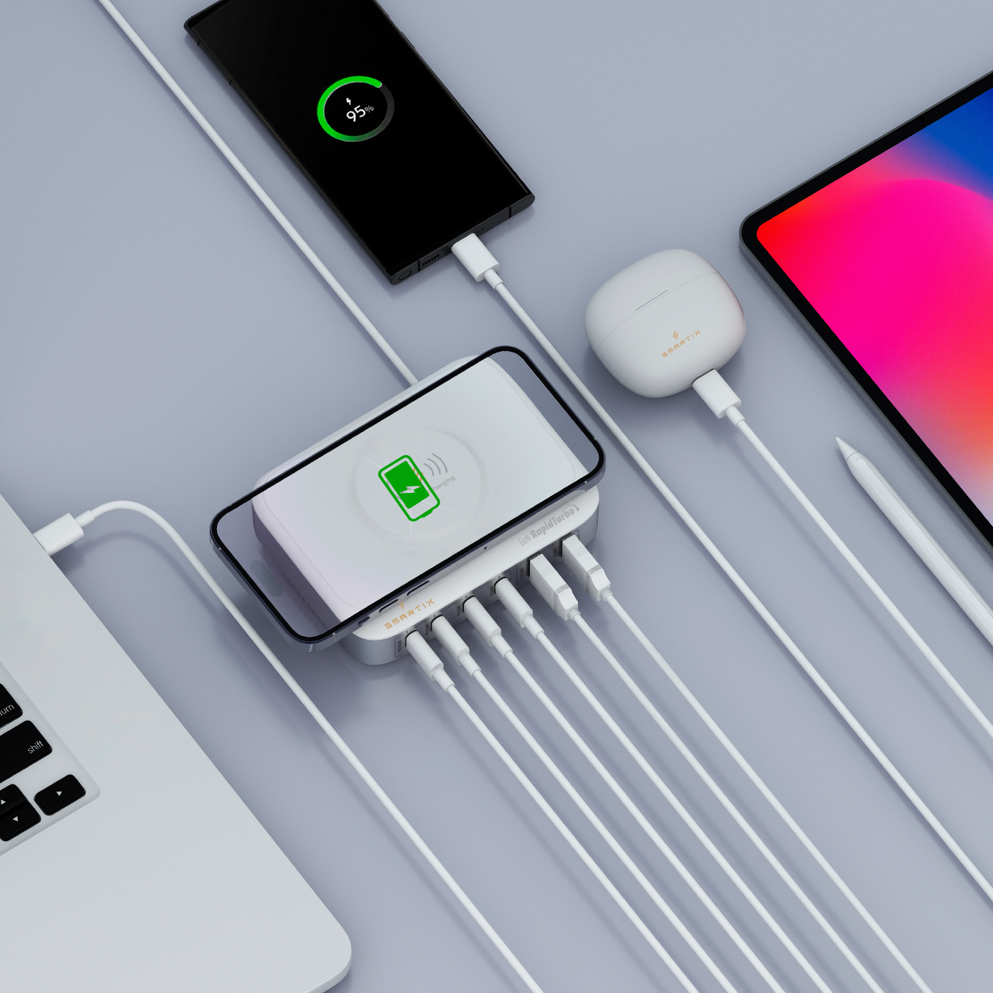 With Smartix Power Hub, you can conveniently charge up to seven devices at the same time at rapid charging speeds, ensuring your devices are ready to go in no time.