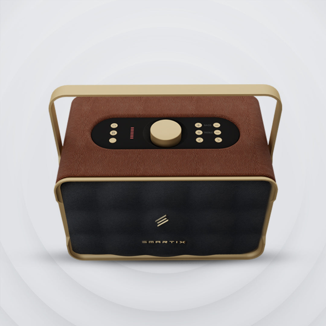 Introducing the SoundPod Studio: a blend of vintage charm and modern functionality. With its iconic design inspired by classic audio equipment, this speaker exudes nostalgia and sophistication. Meticulously crafted with attention to detail, it boasts a textured finish and carefully designed control knobs. The integrated carrying handle ensures effortless portability for on-the-go use. The SoundPod Studio seamlessly merges the best of the past and present, making it an exceptional addition to any environment.