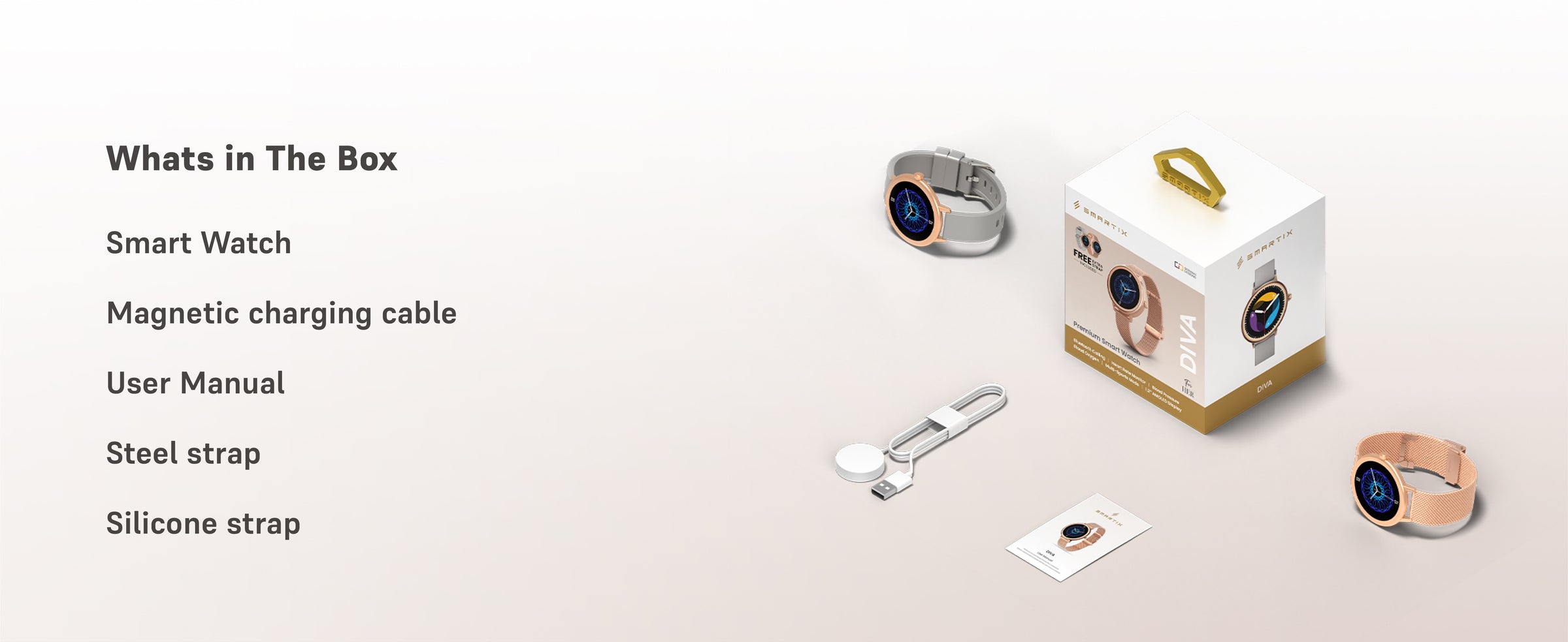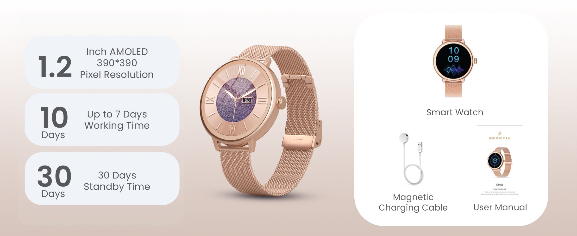 Smartix Diva smartwatch is the perfect all-in-one gadget for health, fitness and communication. It features bluetooth calling, heart rate, blood pressure, blood oxygen monitoring, multi-sport modes and sleep tracking. Keep track of your health metrics right from your wrist to monitor your daily activity and adjust your fitness goals making it the perfect health coach for anyone seeking health and fitness goals. Smartix Diva smartwatch comes with customizable watch faces and extra straps to choose a style that best suits your personality and mood.